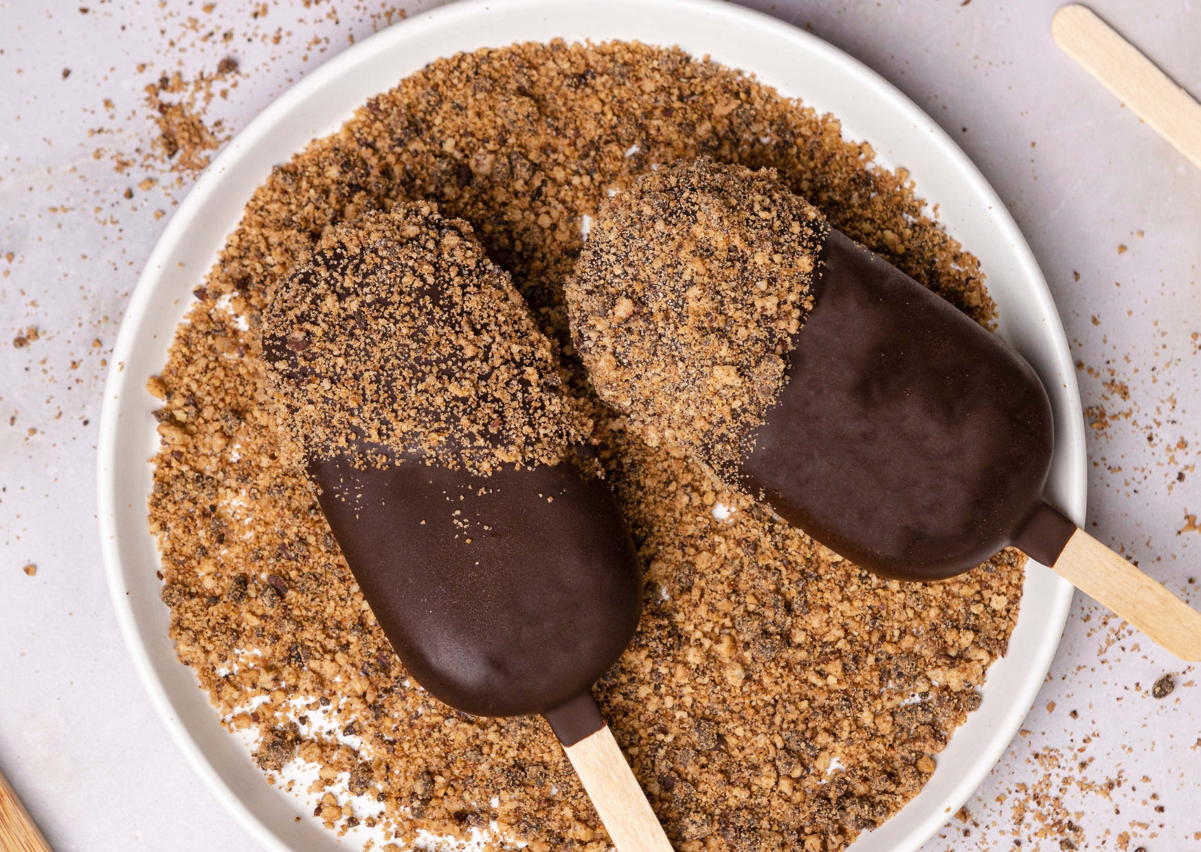 2. Szórjunk 1-1 Ek. kekszmorzsát egy fagylaltos forma aljára és oszlassuk el, fedjük be a